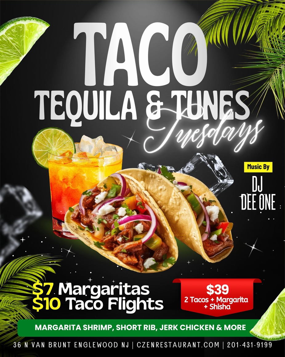 Taco, Tequila & Tunes – Tuesdays at CZEN Englewood! Every Tuesday Every Tuesday, spice up your week with Taco, Tequila & Tunes at CZEN Englewood! Enjoy:
