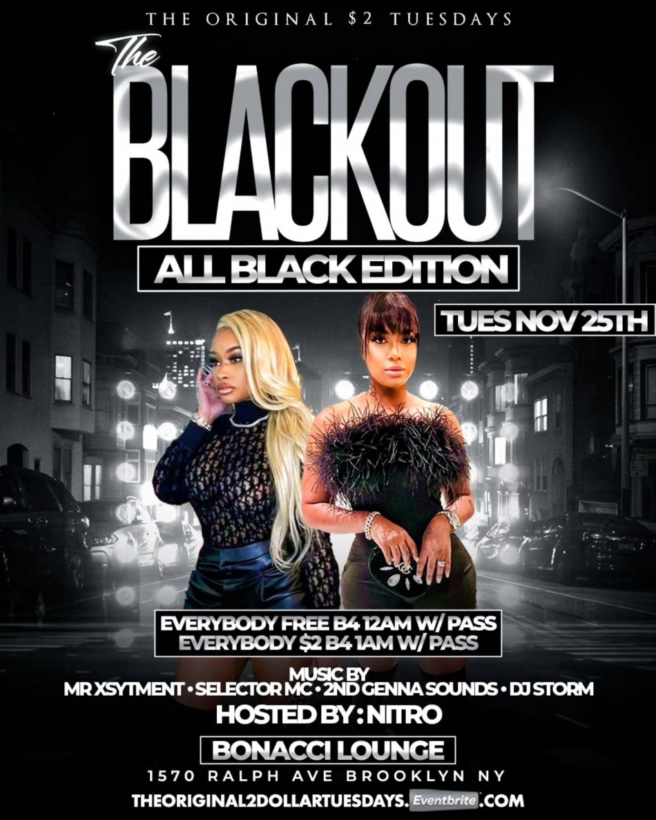 This $2 Tuesday , THE BLACK OUT ♠️ ALL BLACK EDITION ♠️ PARTY • DRINK • SOCIALIZE • EAT • DANCE Music By NYC TOP DJs • @Mrxsytment ...