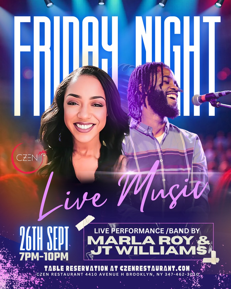 Friday Night Live Music is back @czenenglewood ! Catch the smooth sounds of Marla Roy & JT Williams on August 22, 7PM-10PM at CZEN Englewood.
