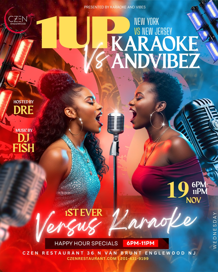 1UP: New York vs New Jersey – The Ultimate Karaoke Showdown! Wednesday November 19th Get ready for the 1st Ever Versus Karaoke at CZEN Englewood — where energy,